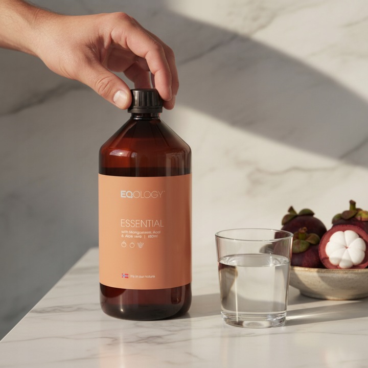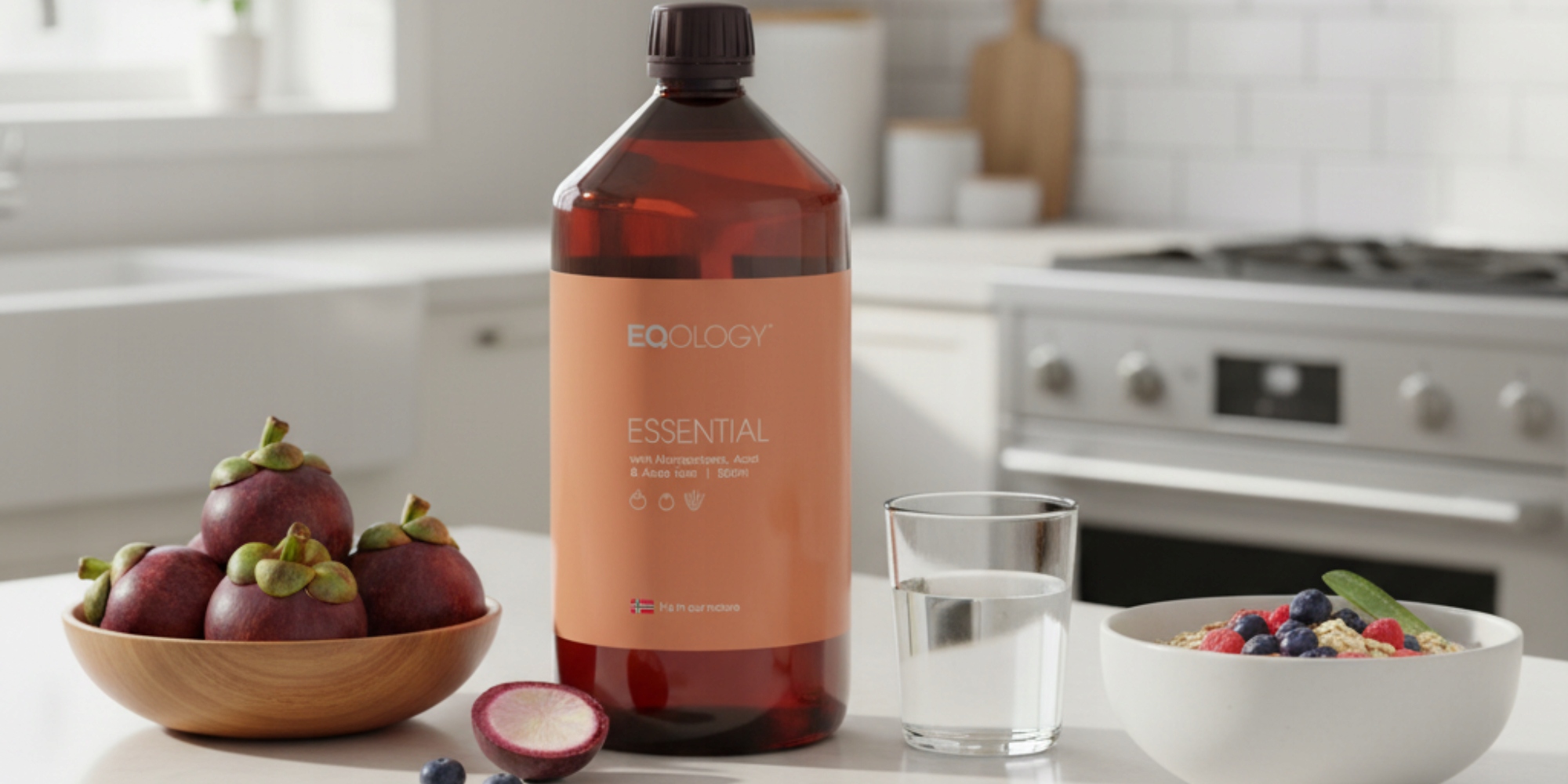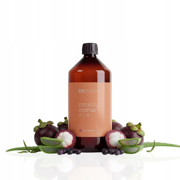 EQOLOGY Essential to kompletny, codzienny suplement witaminowo-mineralny w płynie. Zawiera również ekstrakt z mangostanu, açaí, flawonoidy z jagód oraz ekstrakt z zielonej herbaty.
